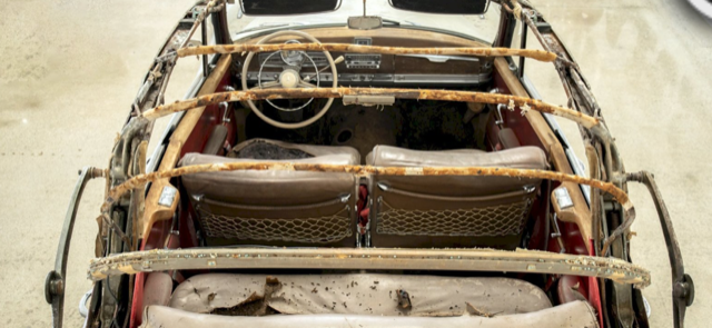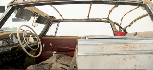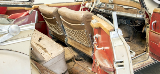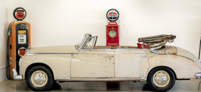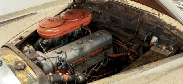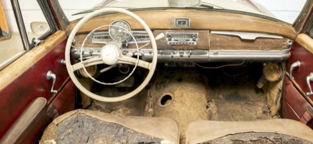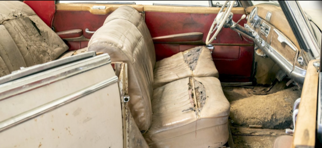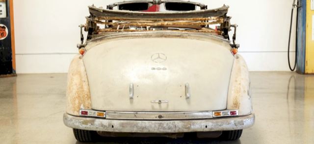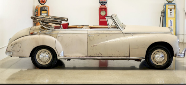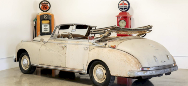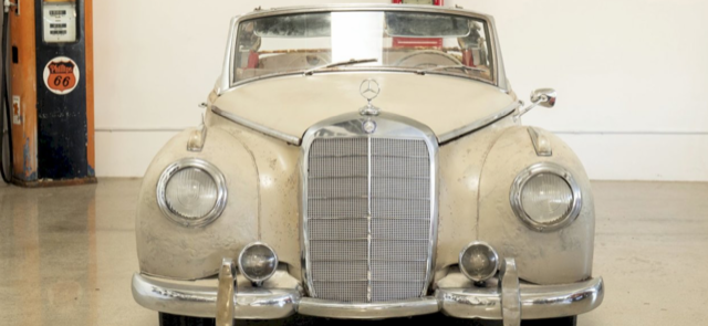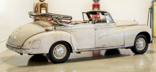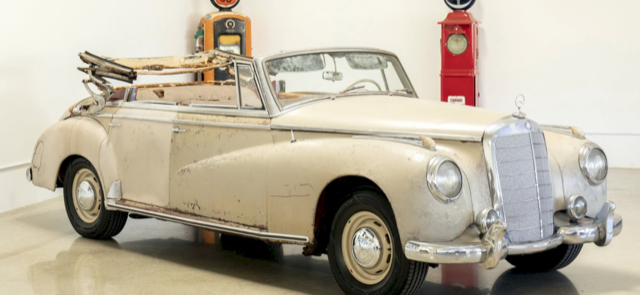 1956 Mercedes Adenauer 300 C Cabriolet „D”: Wszystkie numery pasują; 1 z 51 kiedykolwiek wyprodukowanych; przechowywane w stodole w Oregonie przez 40 lat; oryginalny korpus w stanie stałym; silnik pracuje równomiernie na wszystkich cylindrach. Ten niezwykle rzadki Mercedes został sprzedany jako nowy w Arabii Saudyjskiej, prawdopodobnie komuś z rodziny królewskiej. Nie był napędzany przez ponad 40 lat. Oczyściliśmy gaźniki i serwisowaliśmy silnik, uruchamia się i pracuje równomiernie na wszystkich cylindrach; wszystkie inne układy mechaniczne należy sprawdzić przed rozpoczęciem jazdy. Karta danych Mercedesa jest dołączona, sprawdzając zgodność numeru silnika i skrzyni biegów. Prawdziwy rzadki kawałek historii Mercedesa, znakomity do renowacji z najwyższej półki.