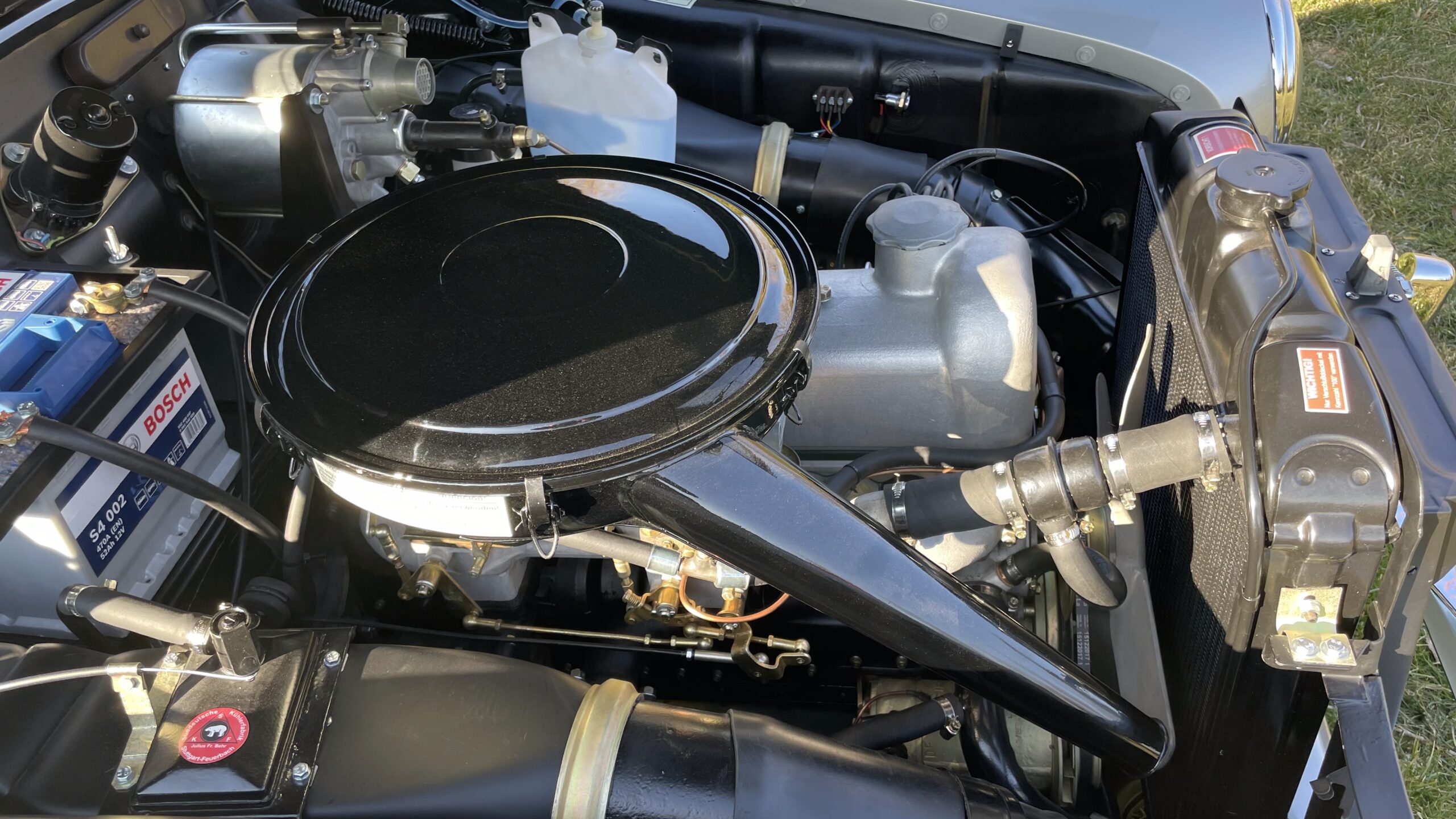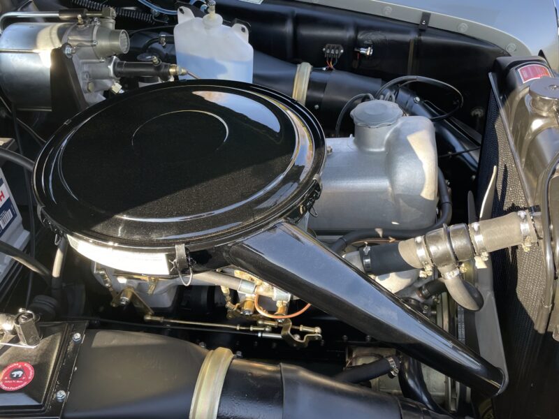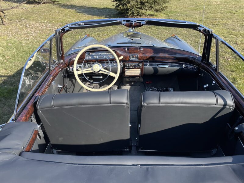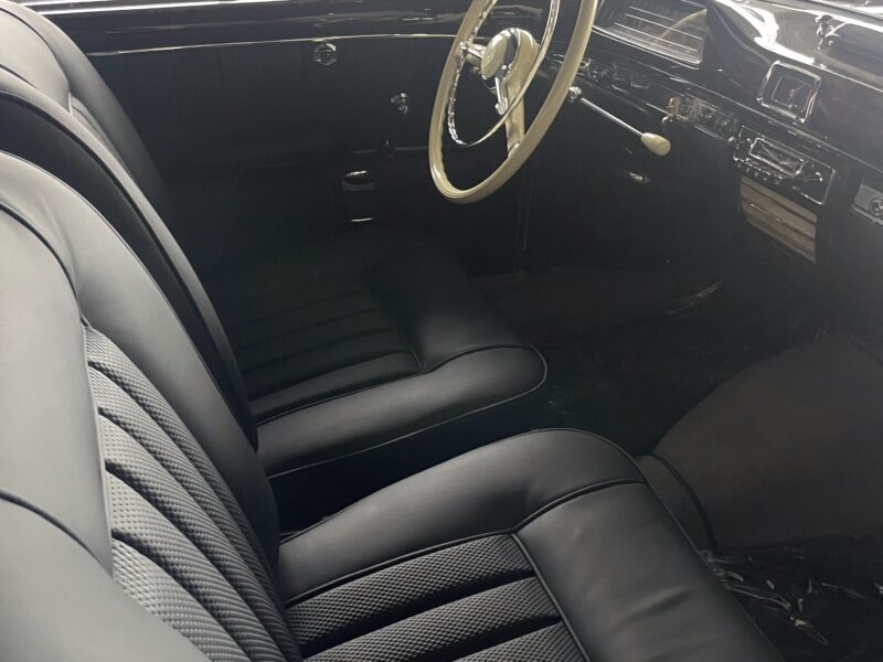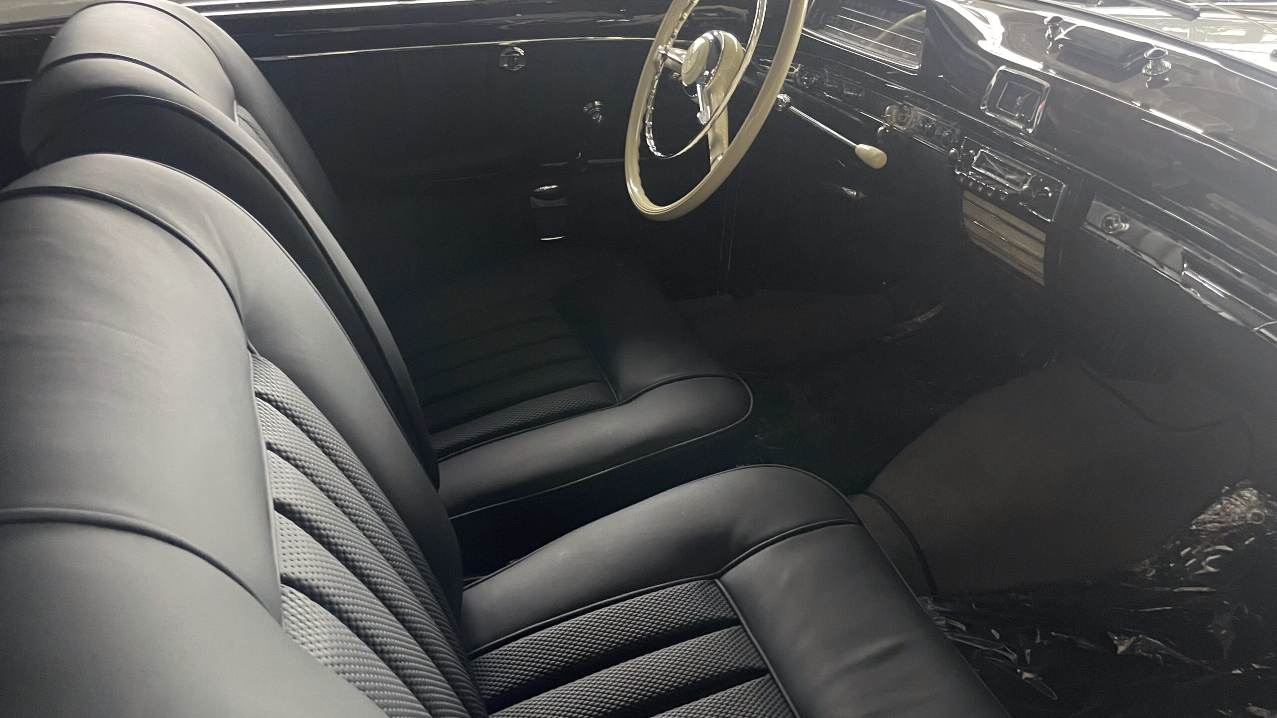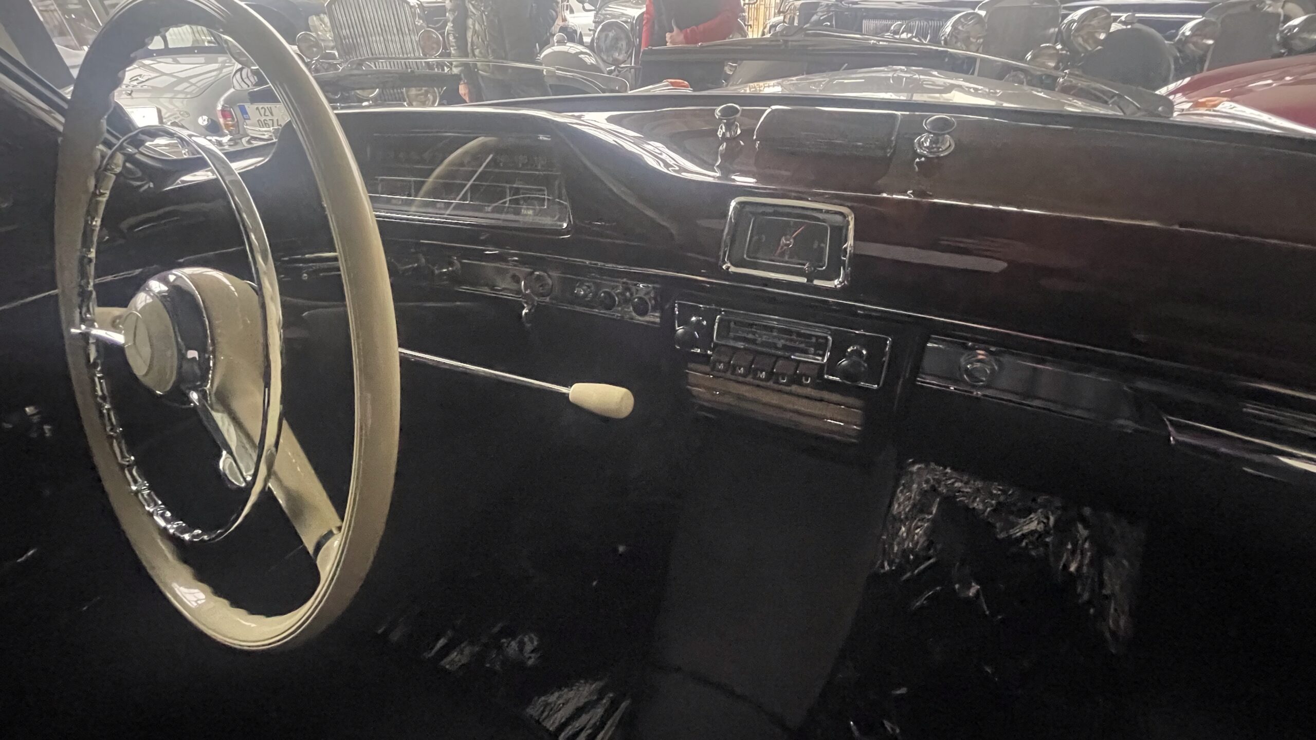 Duże drzwi otwierają się na czarne skórzane wnętrze z ciemnymi drewnianymi intarsjami w drzwiach i desce rozdzielczej. Detale w chromie, tak jak na zewnątrz. Każdy szczegół oraz całe wnętrze daje niesamowite wrażenie. Duża kierownica w kolorze kości słoniowej daje lekki kontrast, a tuż za nią 4-biegowa manualna skrzynia biegów. Deska rozdzielcza jest prosta, ale luksusowa z poziomymi wskaźnikami, a pośrodku piękny mały zegar. Wszystko sprawia wrażenie sztuki.