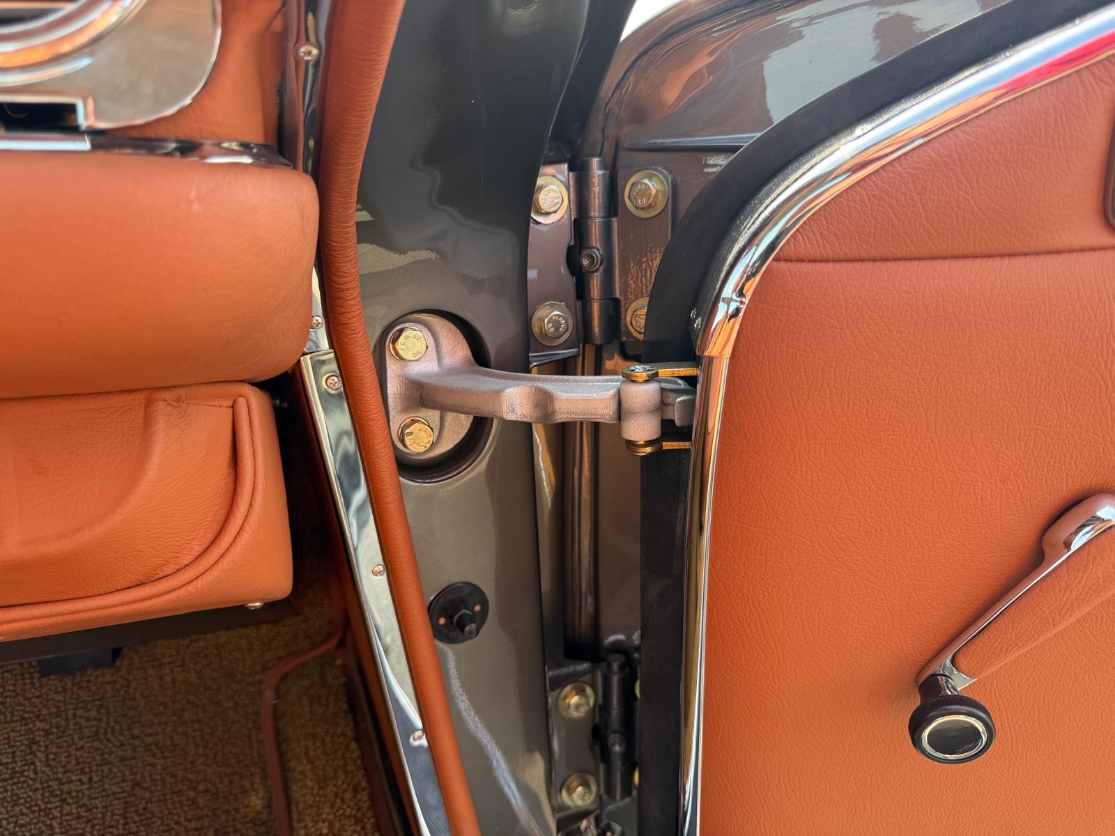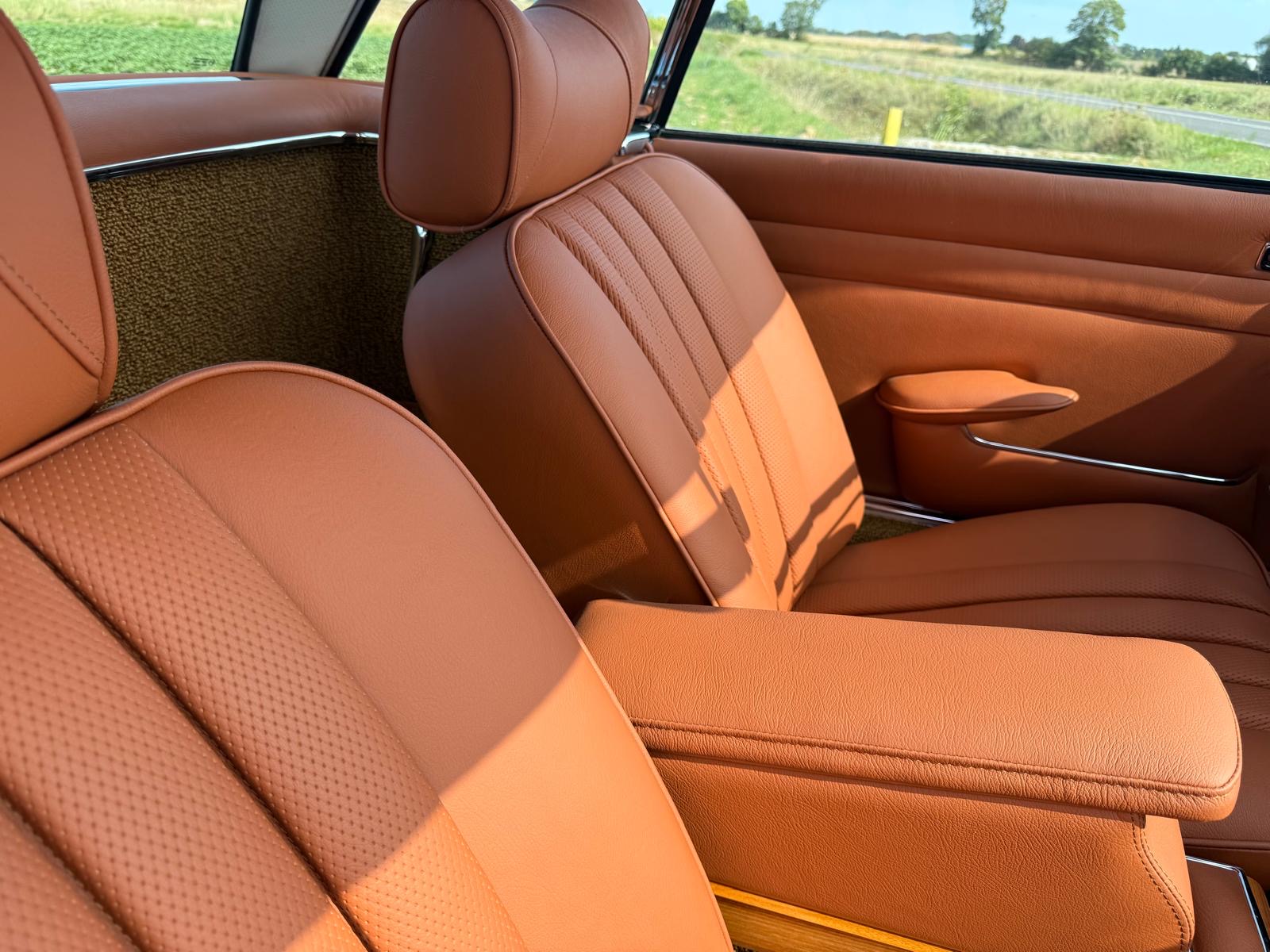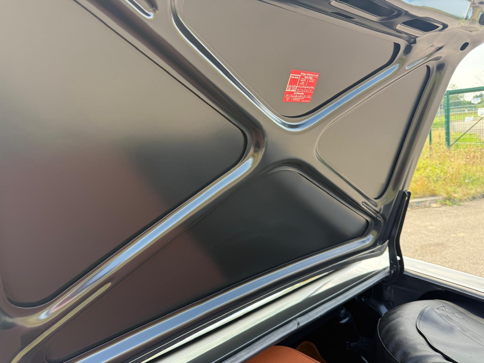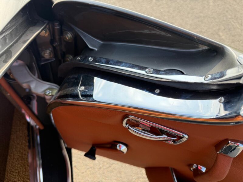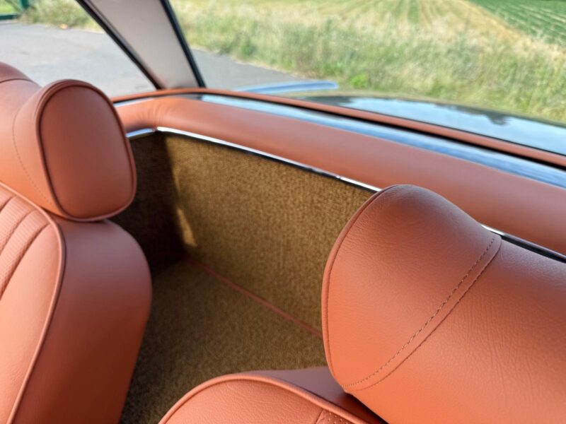 Rozebrany na goły metal, został całkowicie odbudowany i odnowiony w promiennej metalicznej farbie. Wnętrze tapicerowane jest w bogatej skórze , idealnie dopasowanej do miękkiego blatu z tkaniny.