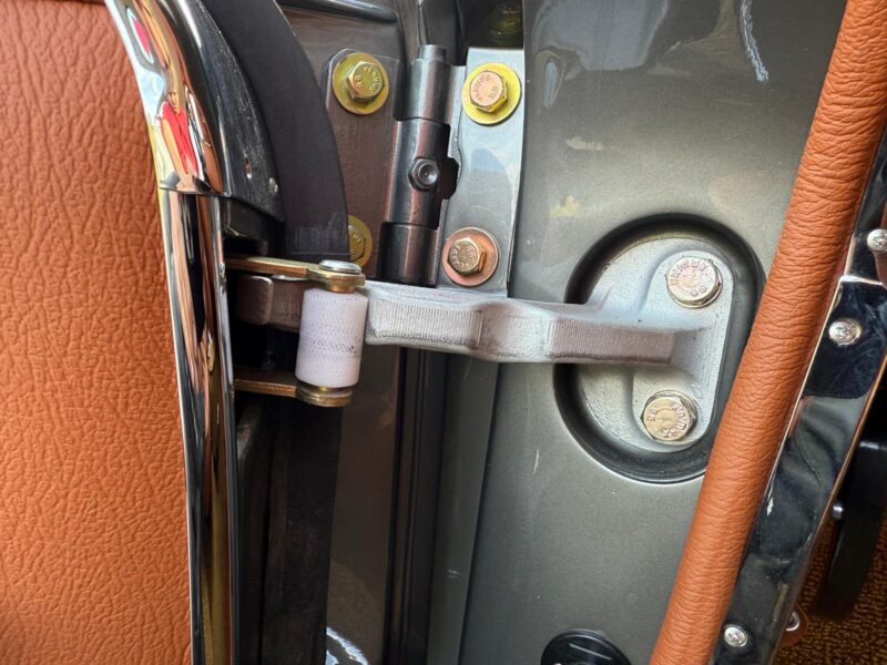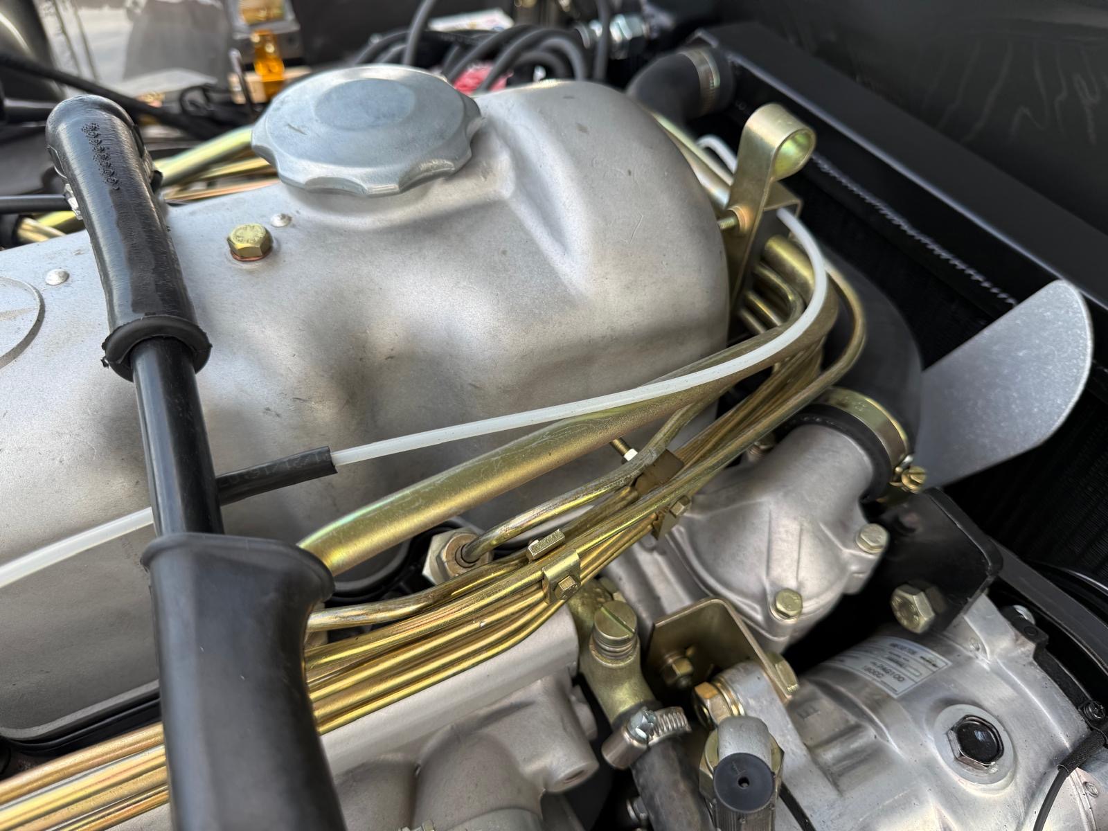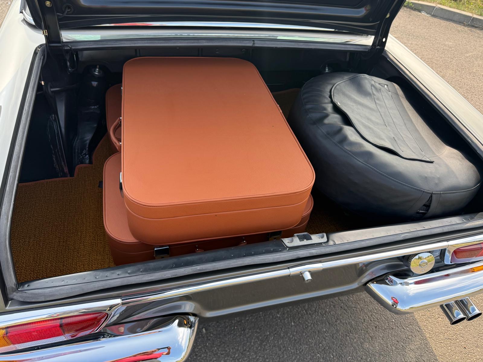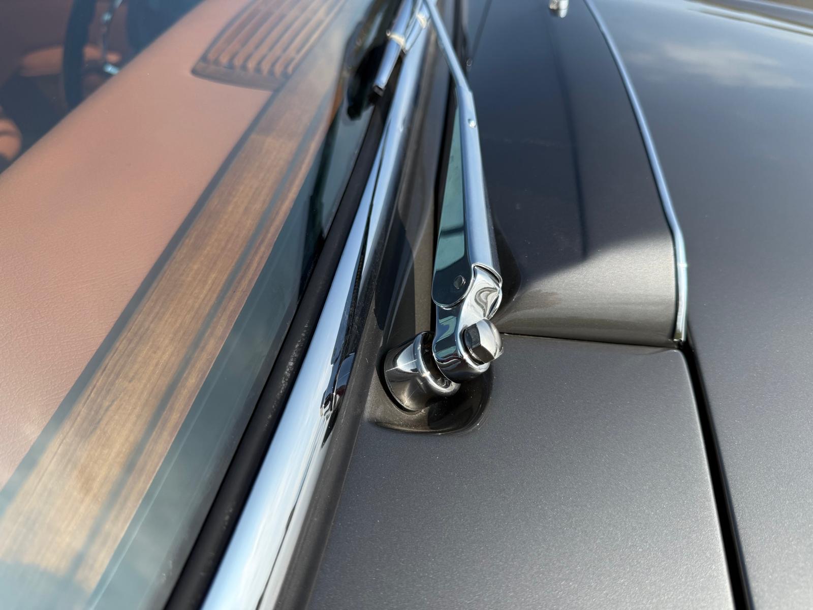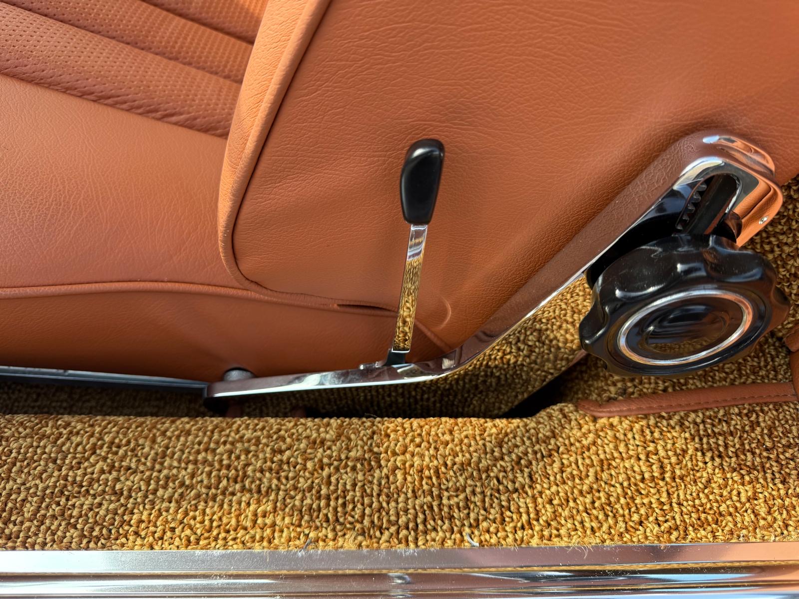 Rozebrany na goły metal, został całkowicie odbudowany i odnowiony w promiennej metalicznej farbie. Wnętrze tapicerowane jest w bogatej skórze , idealnie dopasowanej do miękkiego blatu z tkaniny.